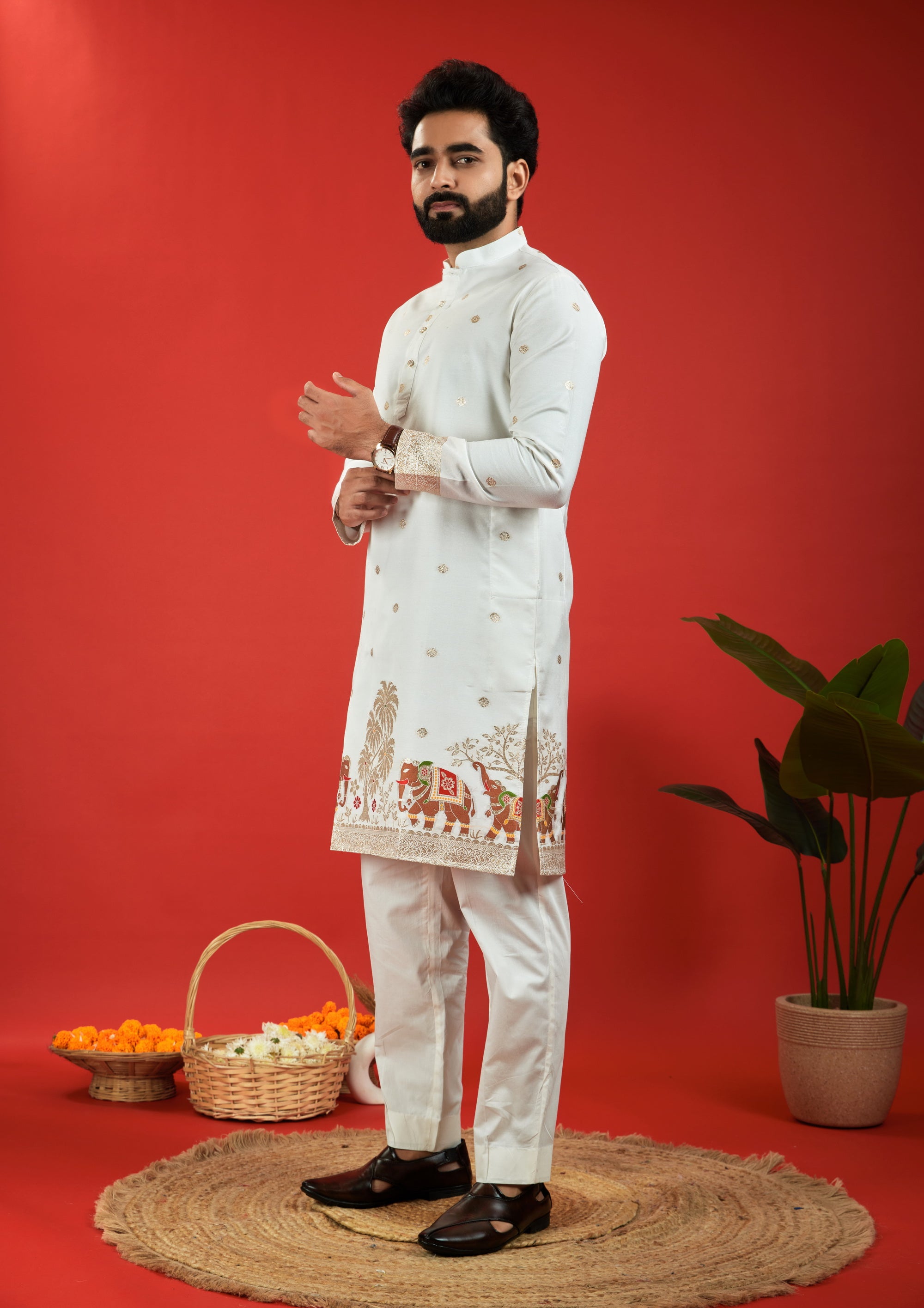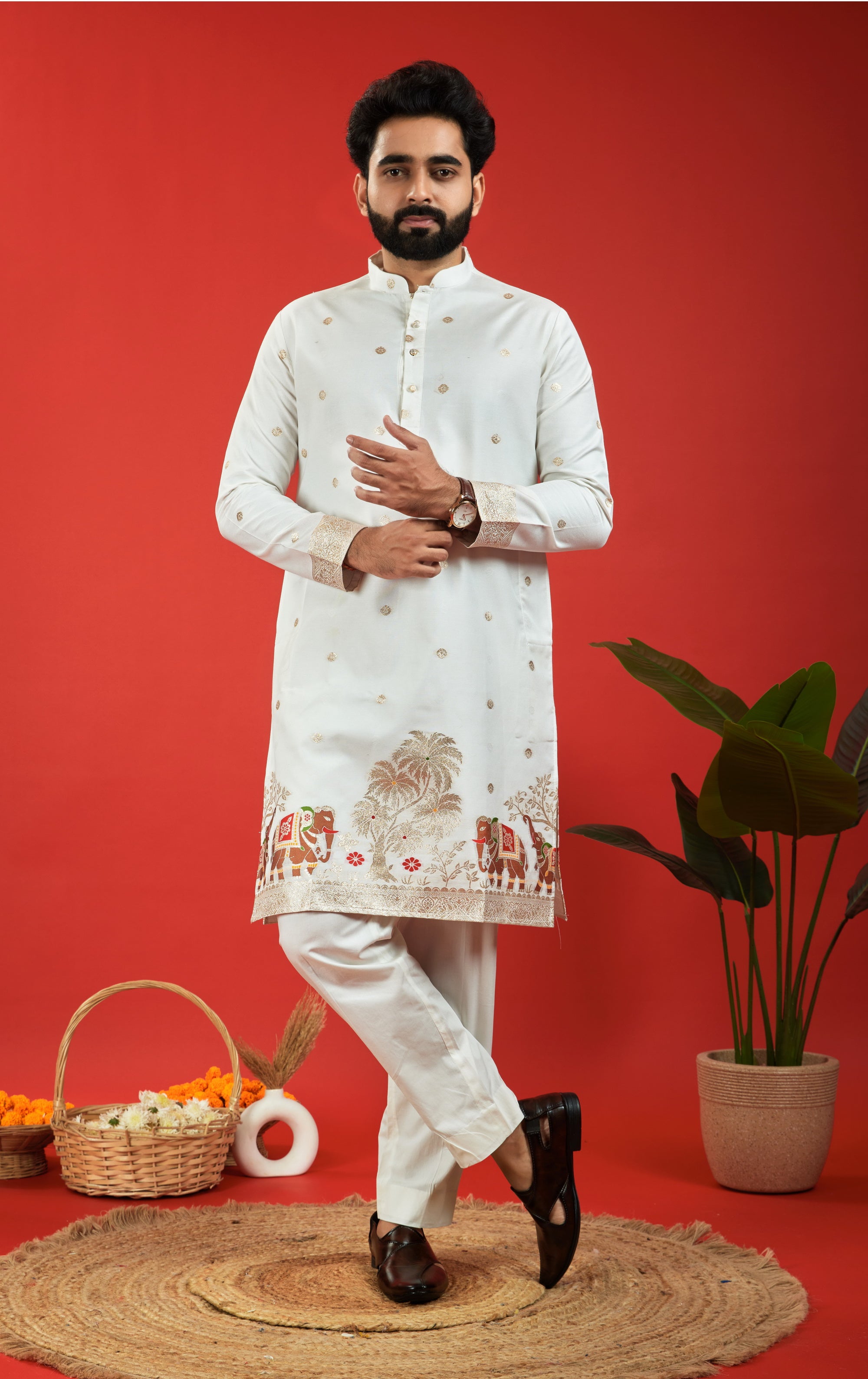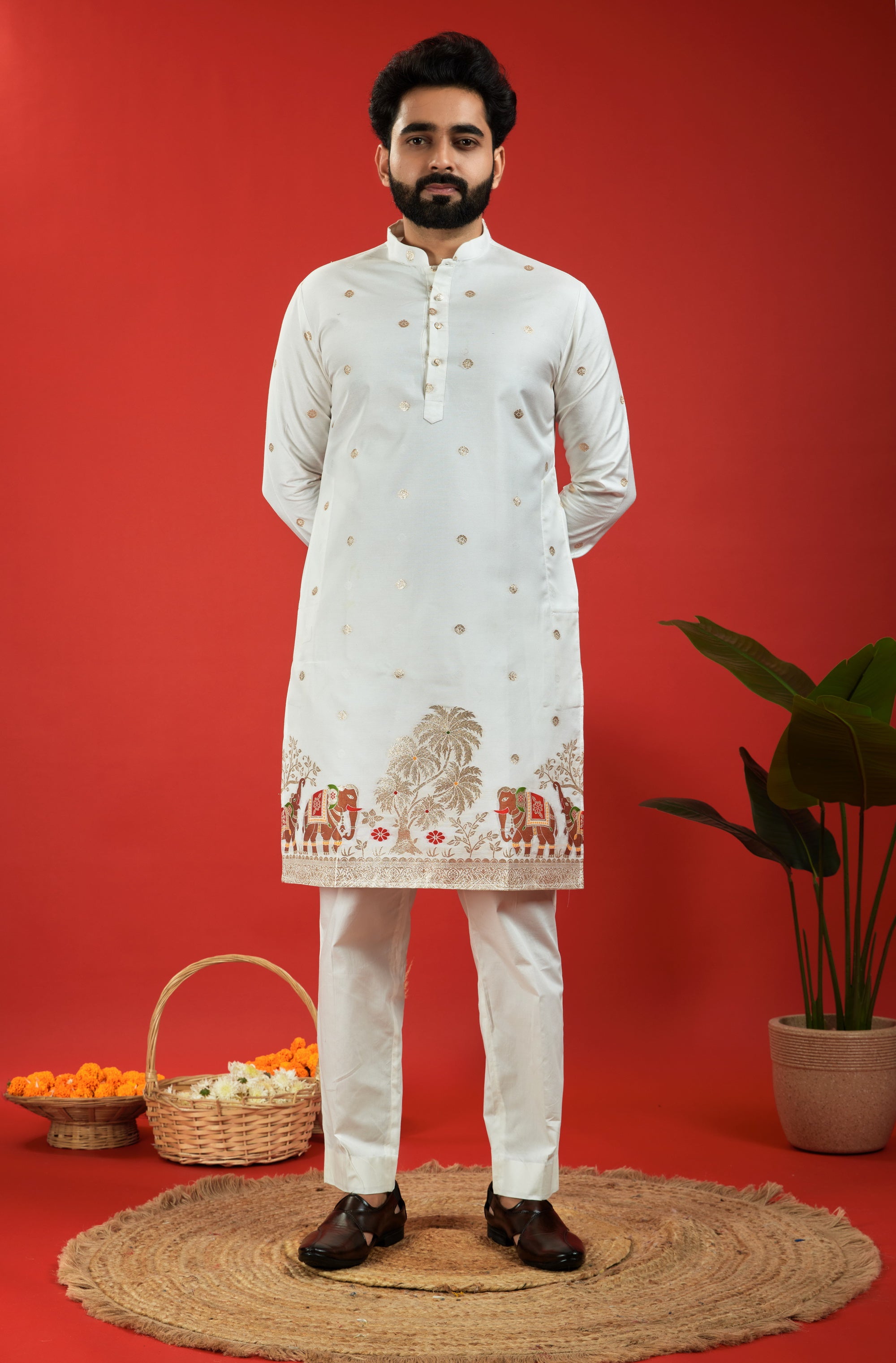 ELEPHANT WITH KALAS PATTERN JACQUARD DESIGNER WHITE KURTA
