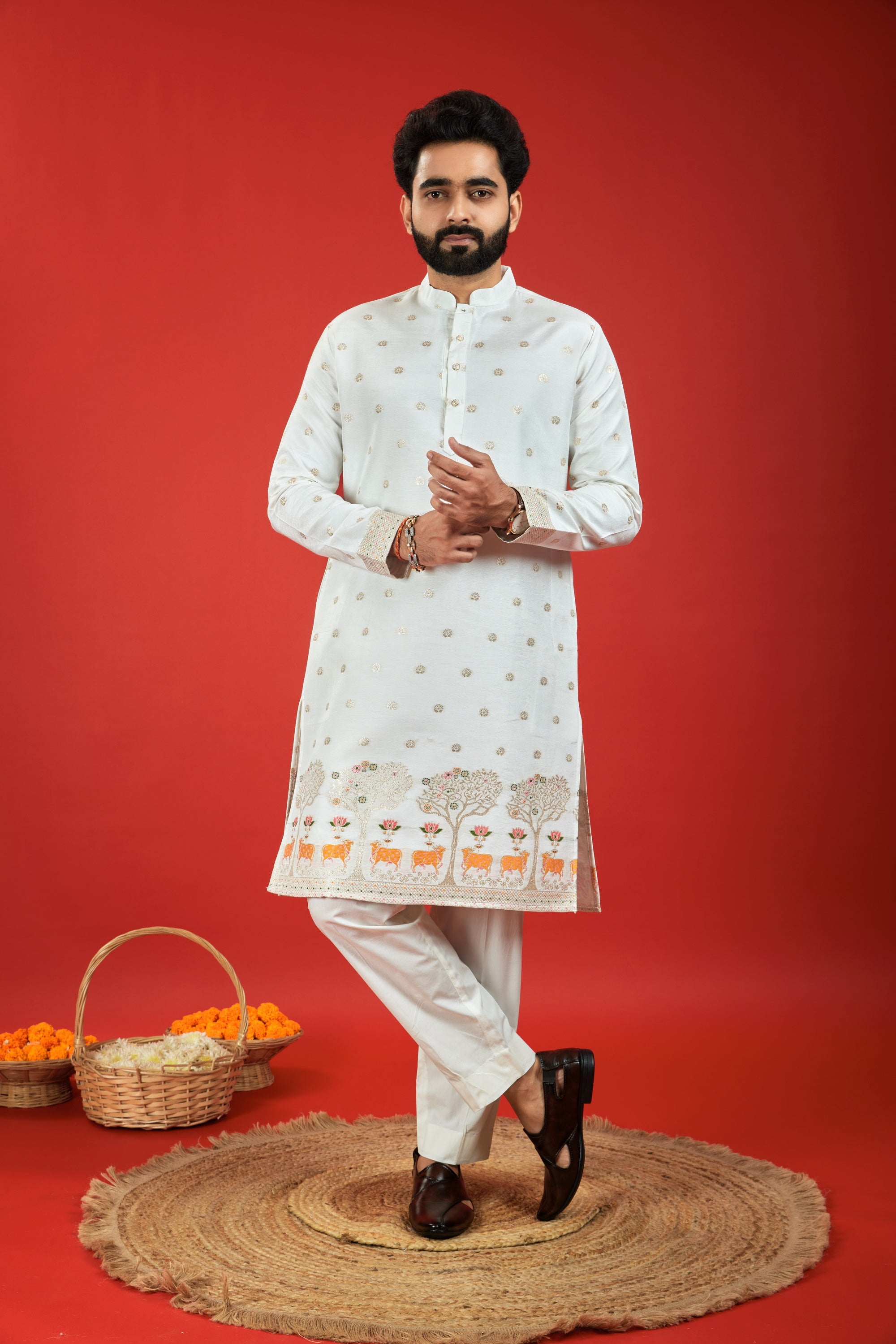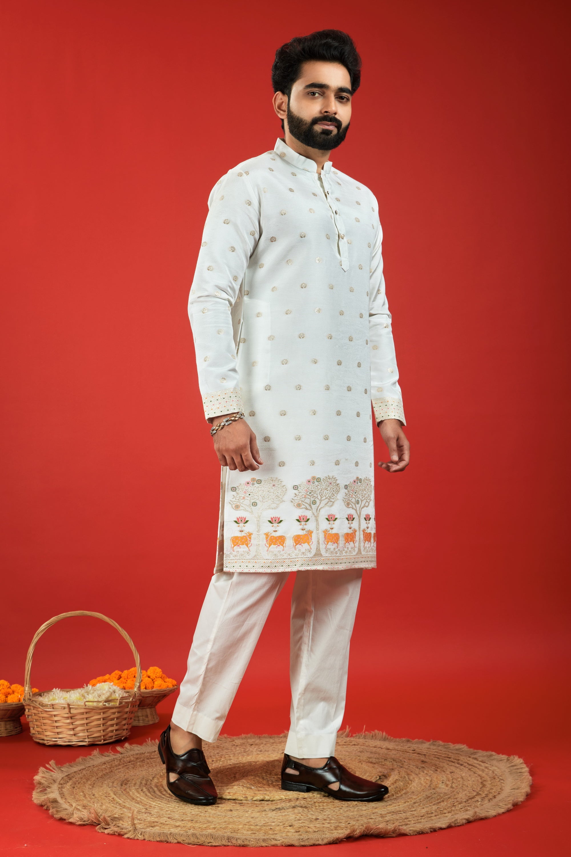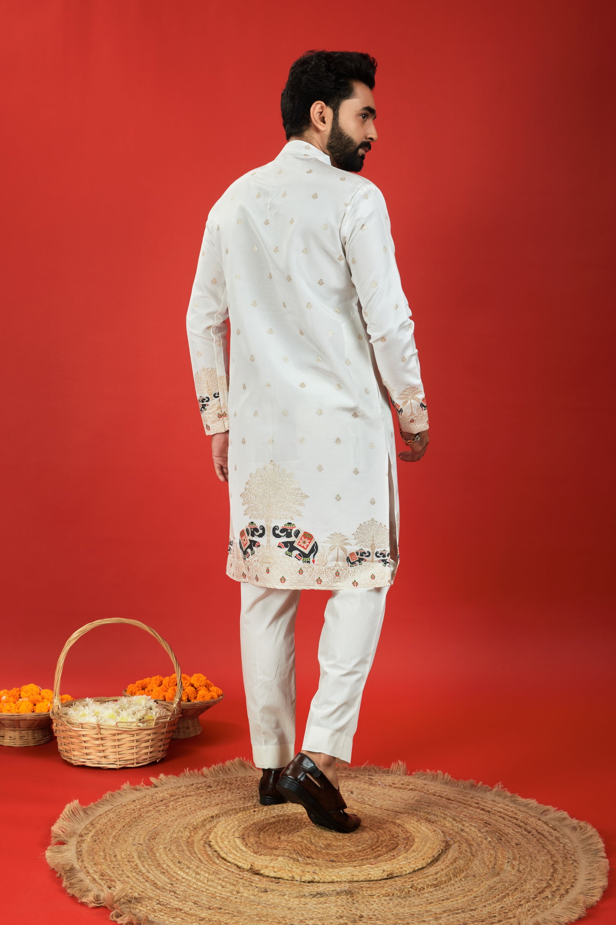 ELEPHANT WITH KALAS PATTERN JACQUARD DESIGNER WHITE KURTA