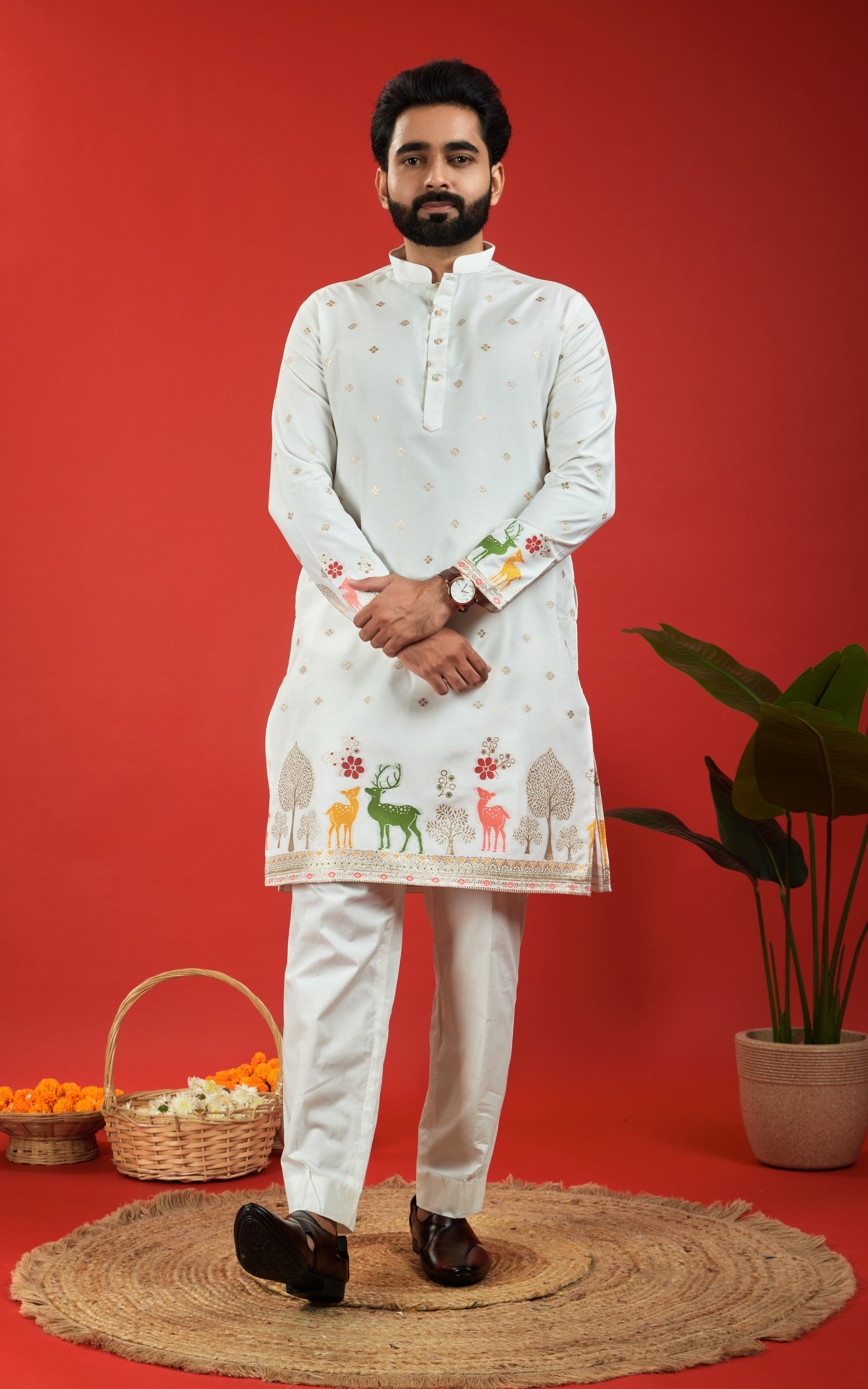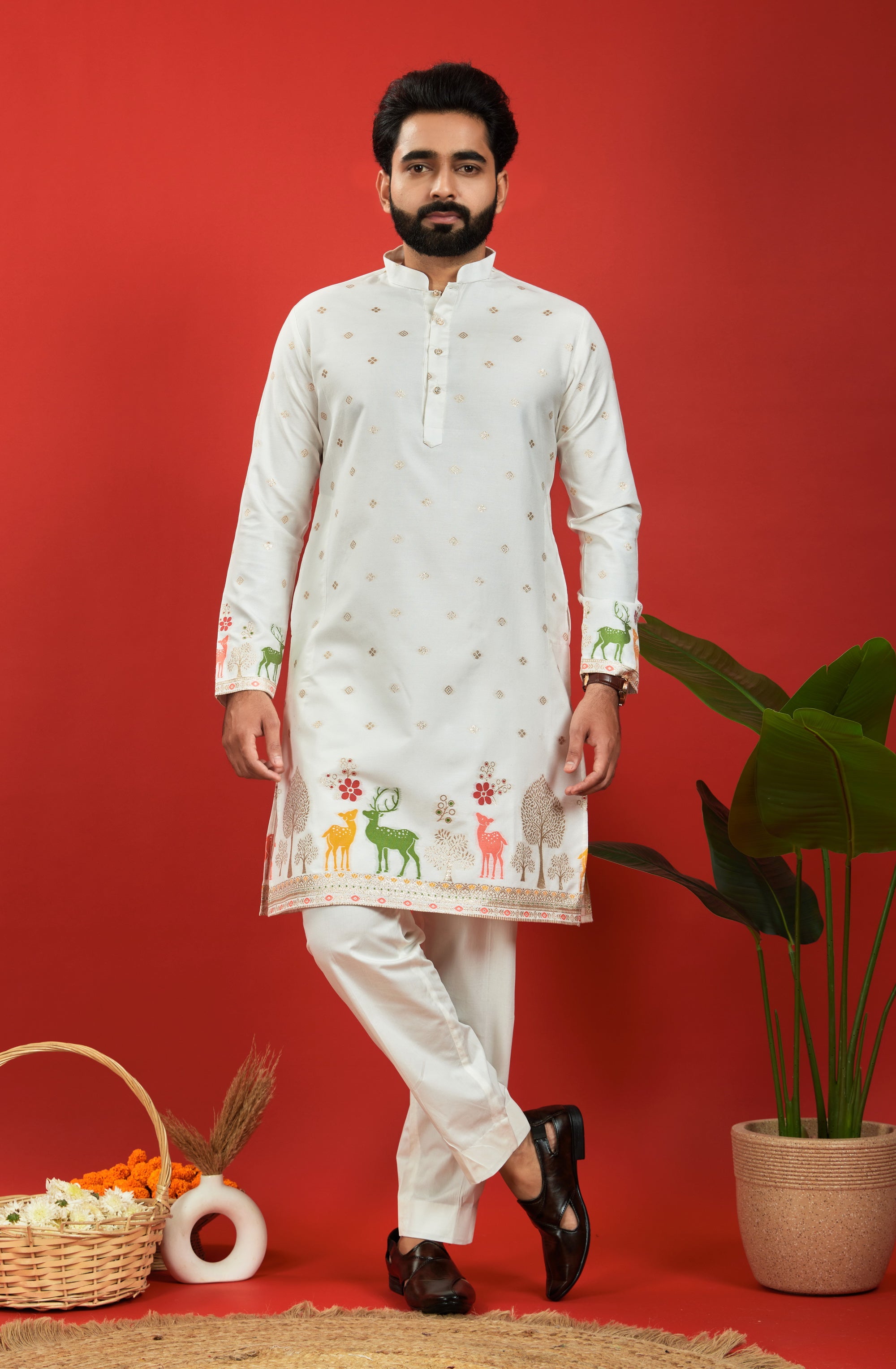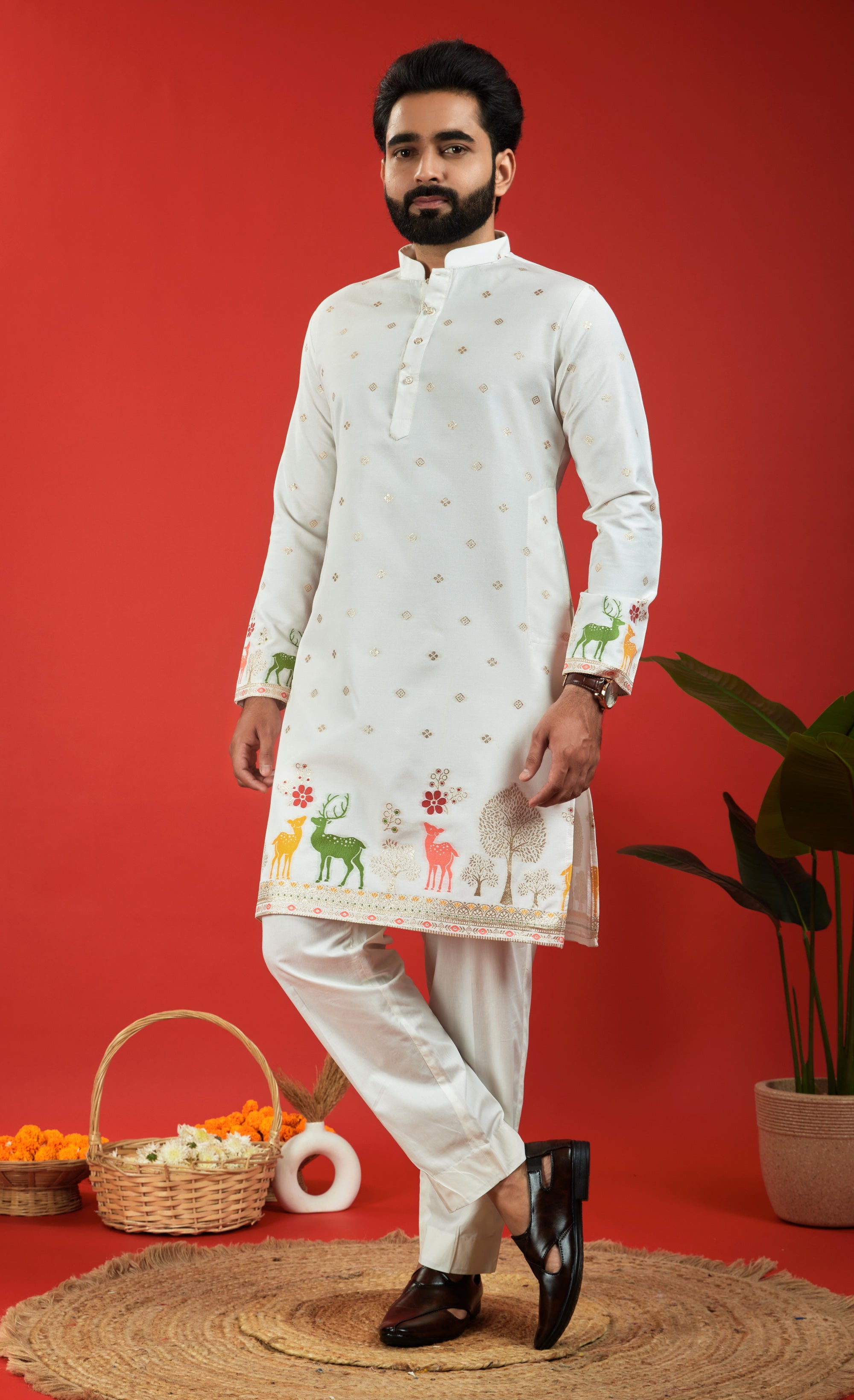 WHITE DEER PATTERN JACQUARD DESIGNER KURTA