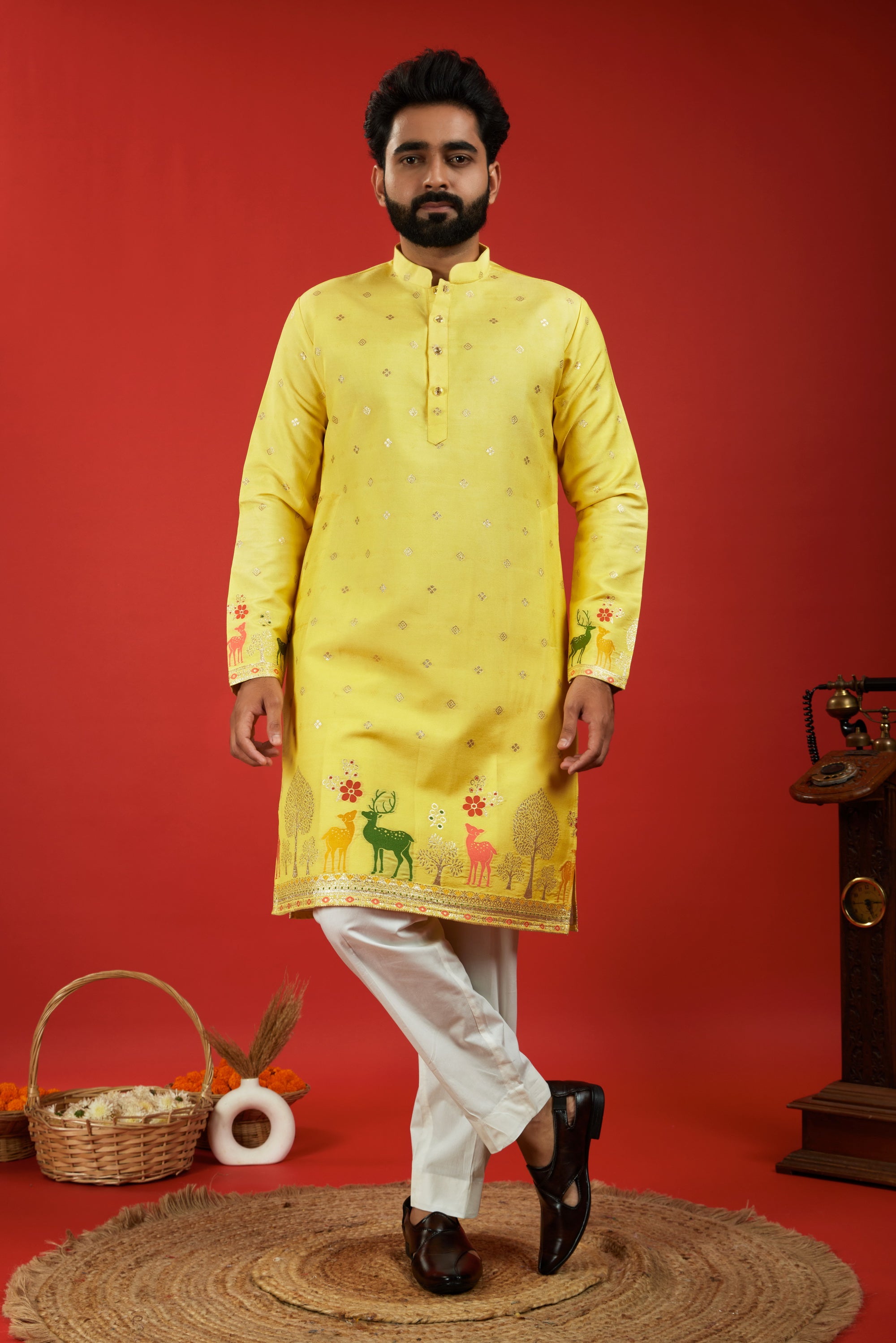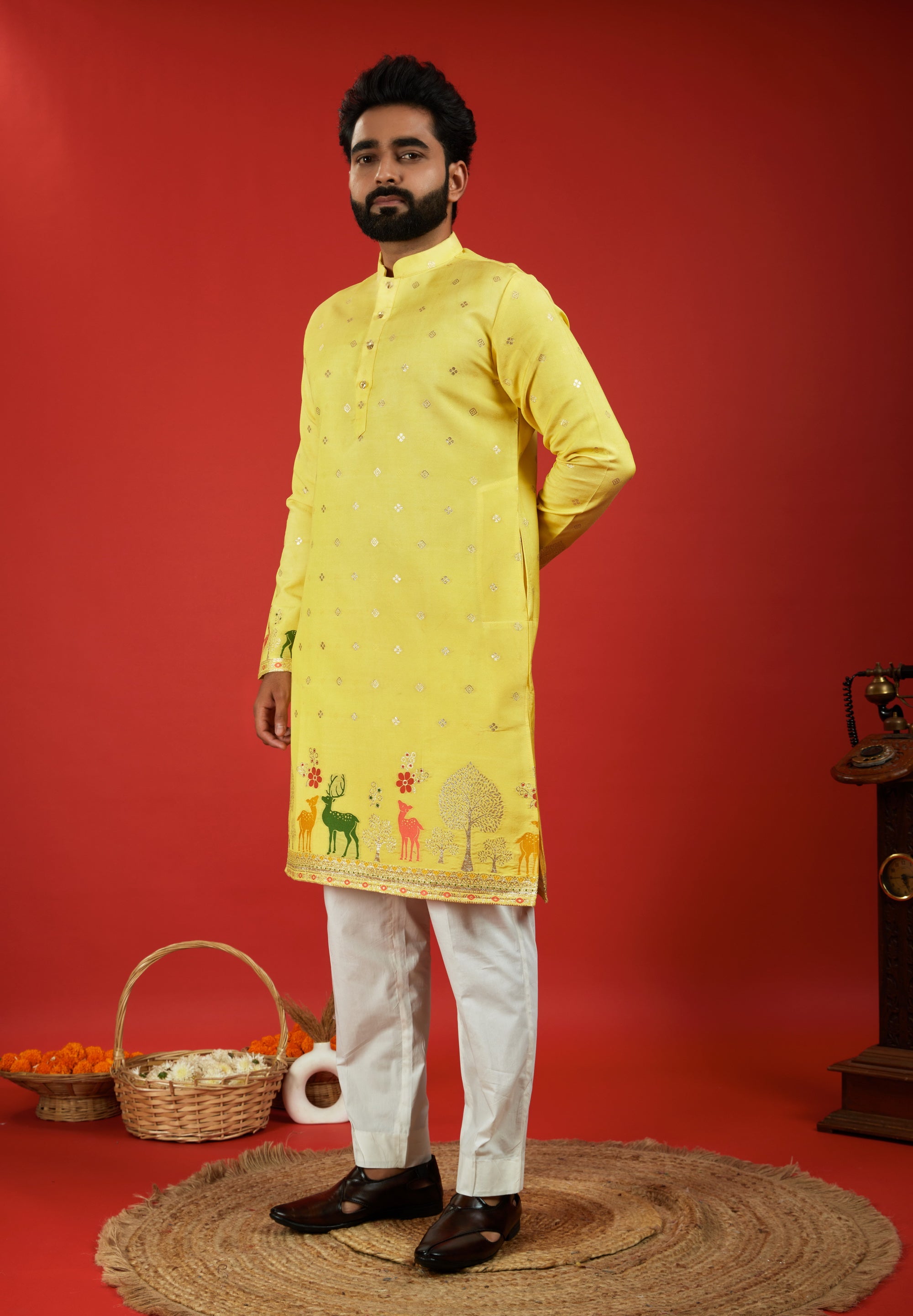 YELLOW DEER PATTERN JACQUARD DESIGNER KURTA