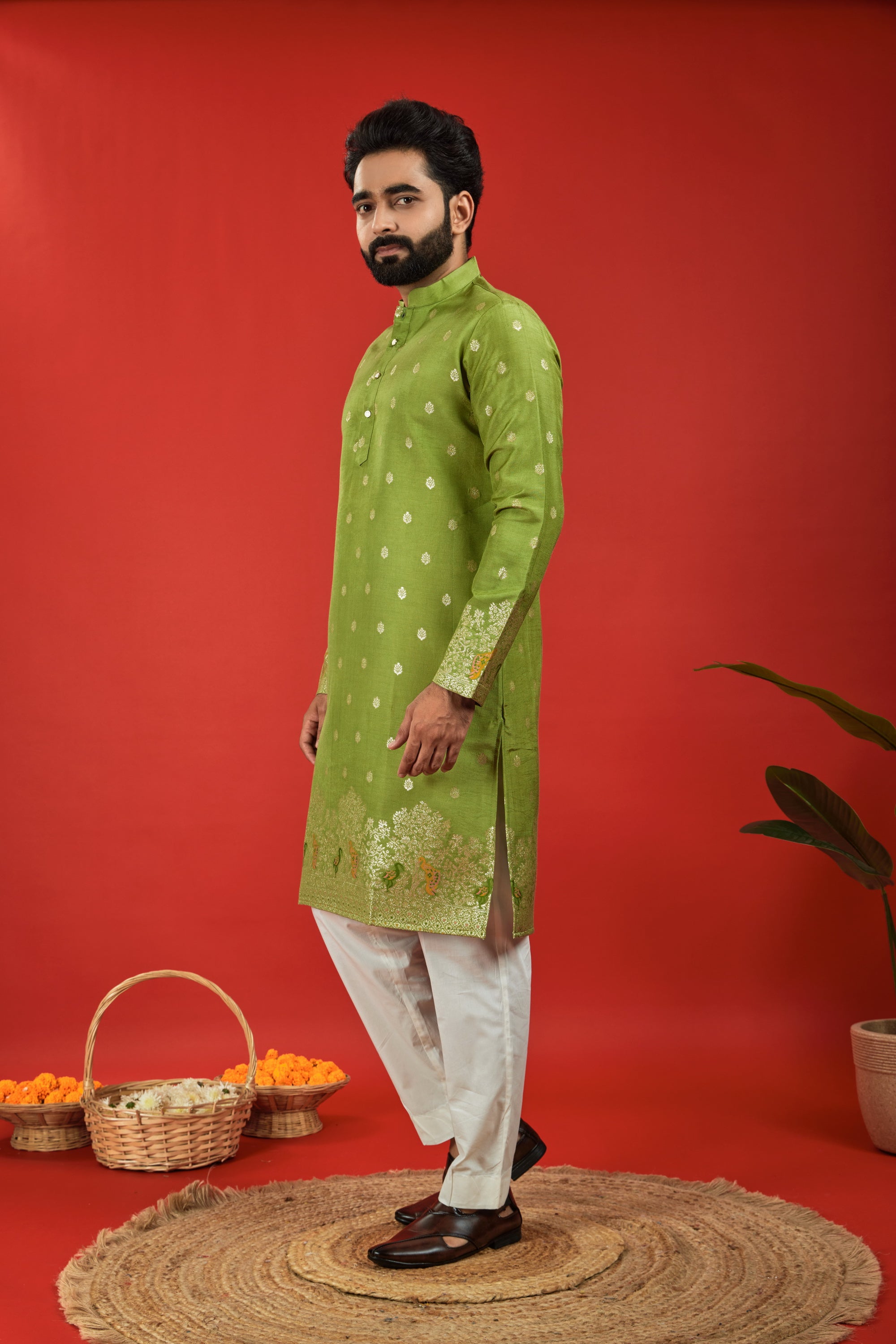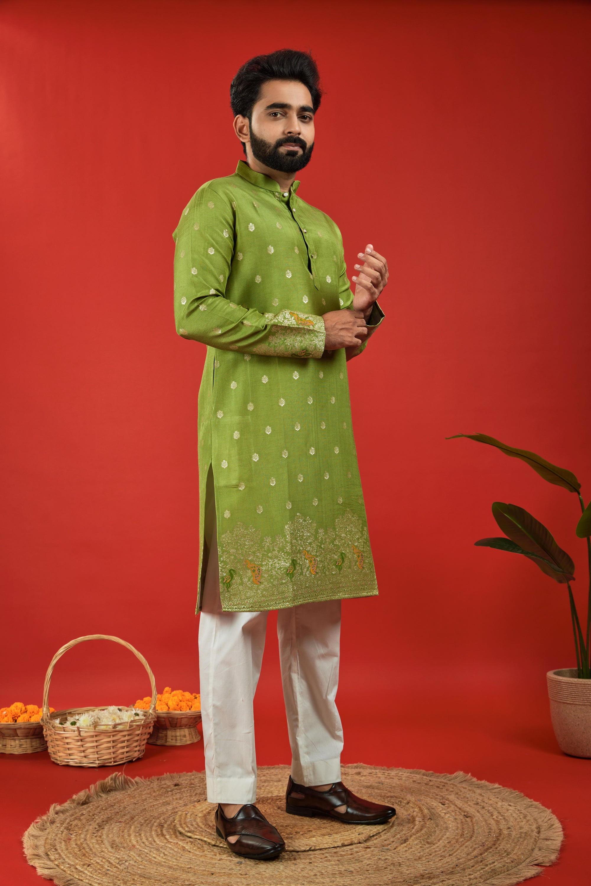 MEHANDI BIRDS PATTERN JACQUARD DESIGNER KURTA