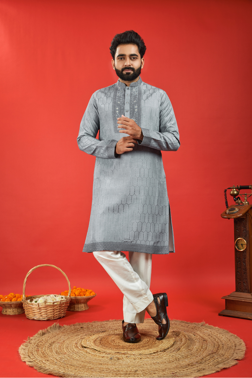 SMOKY GREY FLORAL NECK JACQUARD DESIGNER KURTA